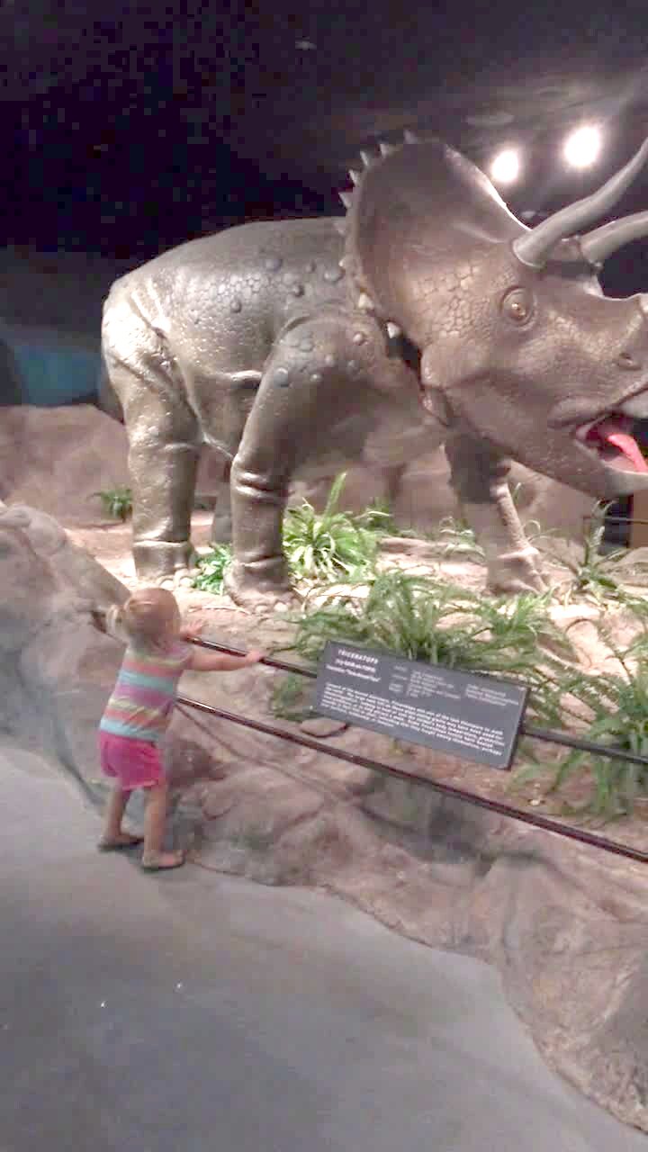 A tot girl walks up to a museum dinosaur and waves hello. The dinosaur roars and scares her before jumps and runs away.