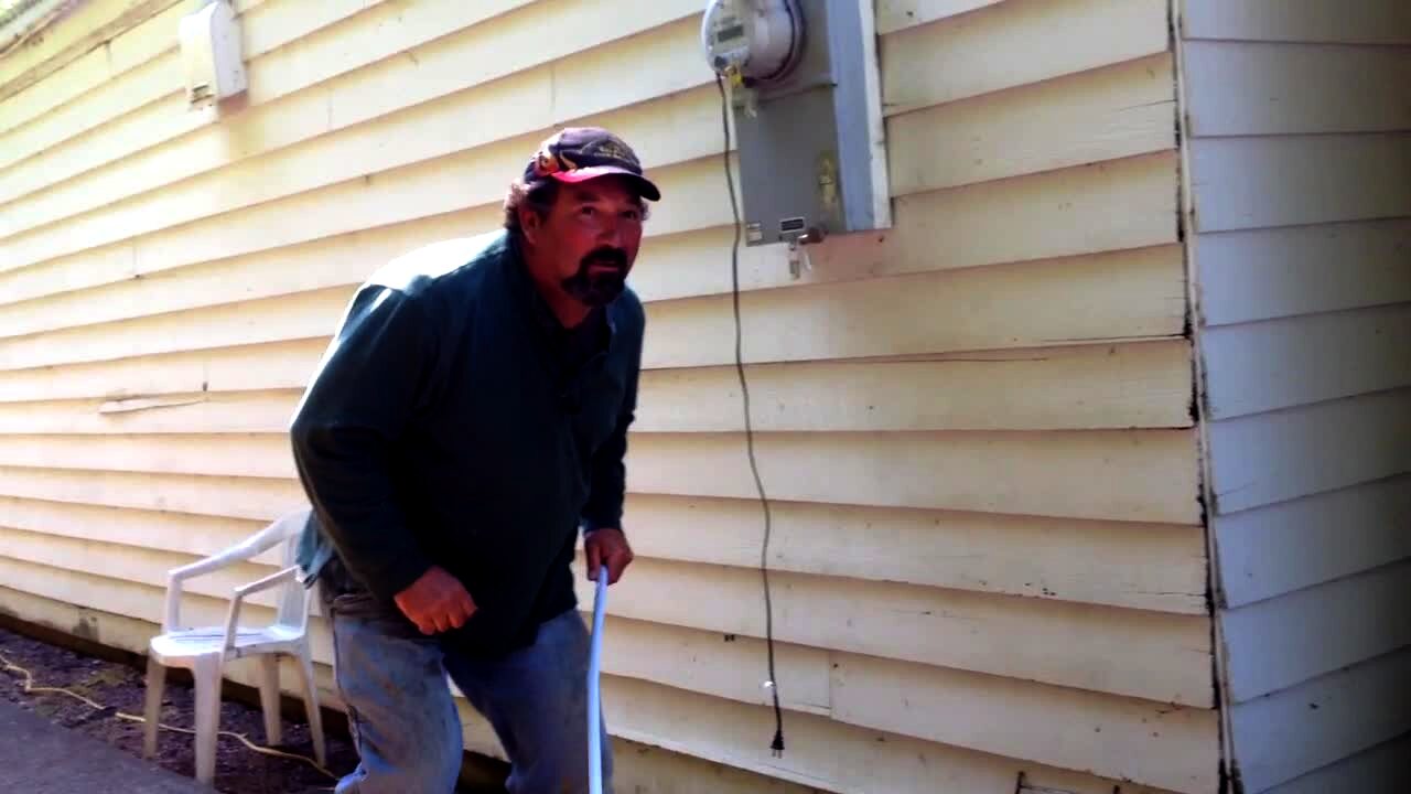 A man bangs on a broken piece of siding outside his house with a broom and a bat flies out and scares him. He continues to bang on the siding and as more bats fly out, he gets more and more startled and begins shaking his broom around at them.