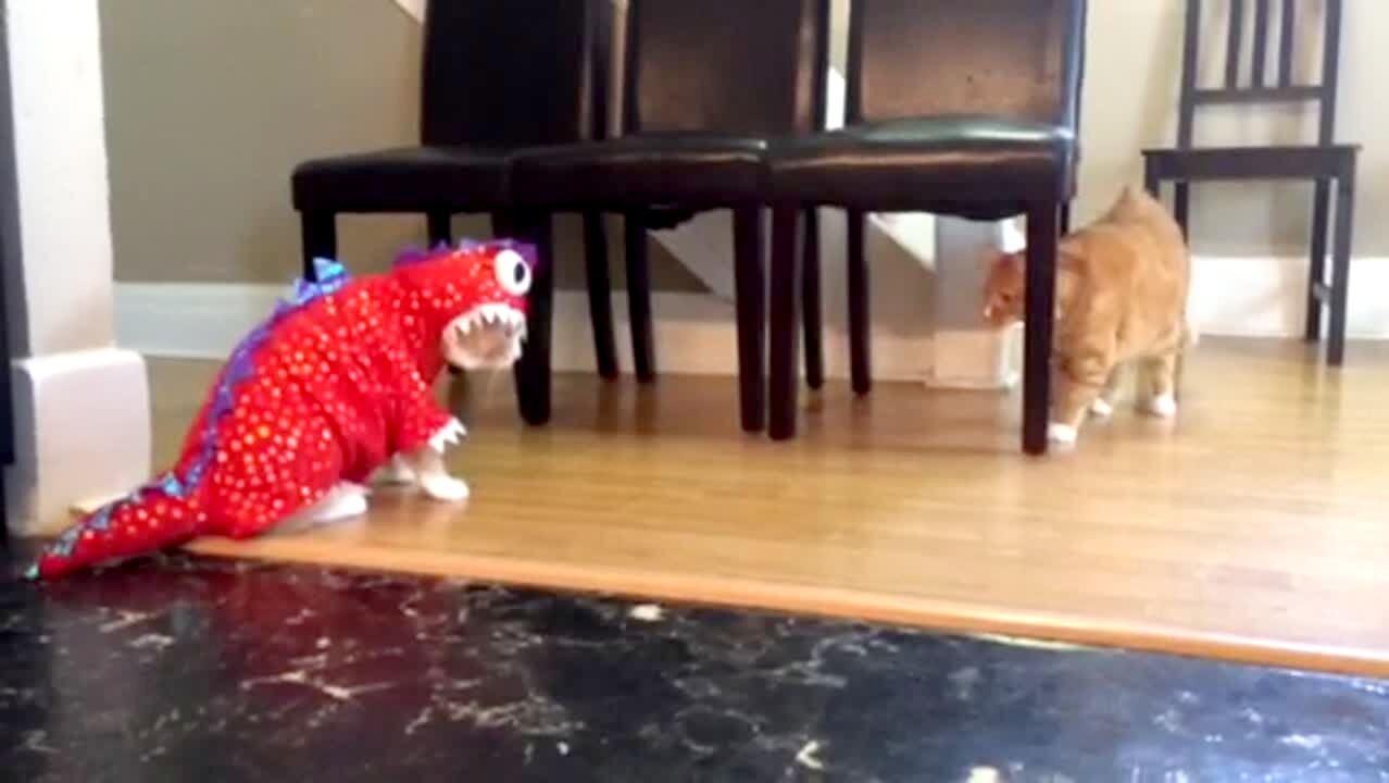 A cat wears a dinosaur Halloween costume indoors and when a tabby cat approaches and sees the costumed cat, he arches his back and slowly backs away before the costumed cat falls over while trying to walk and the tabby cat runs away.