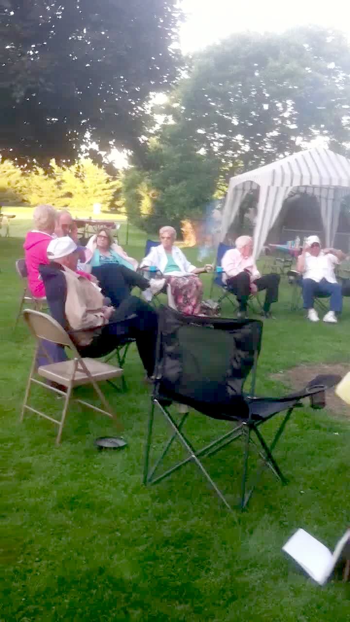 A teen girl steps onto a porch outdoors while another teen girl hums a song on a porch swing. The first teen girl asks what she's doing before the humming girl screams to scare her and the first teen girl falls backwards over the porch railing. Scare.
