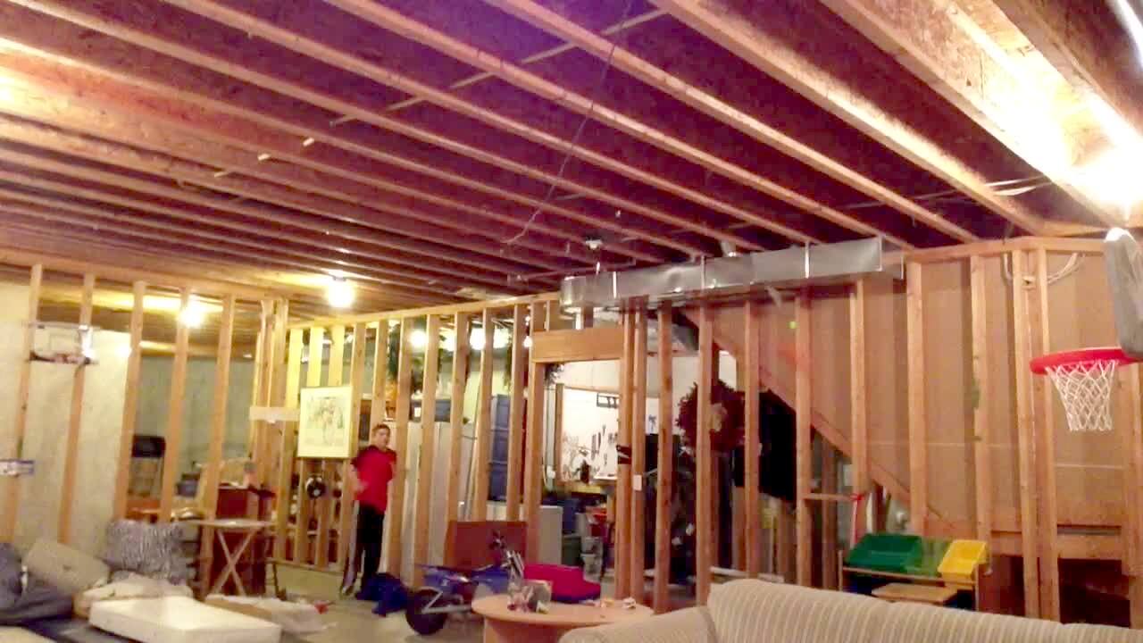 A boy tosses a basketball to his brother and his brother shoots for a basket but hits a light on the ceiling and it shatters.