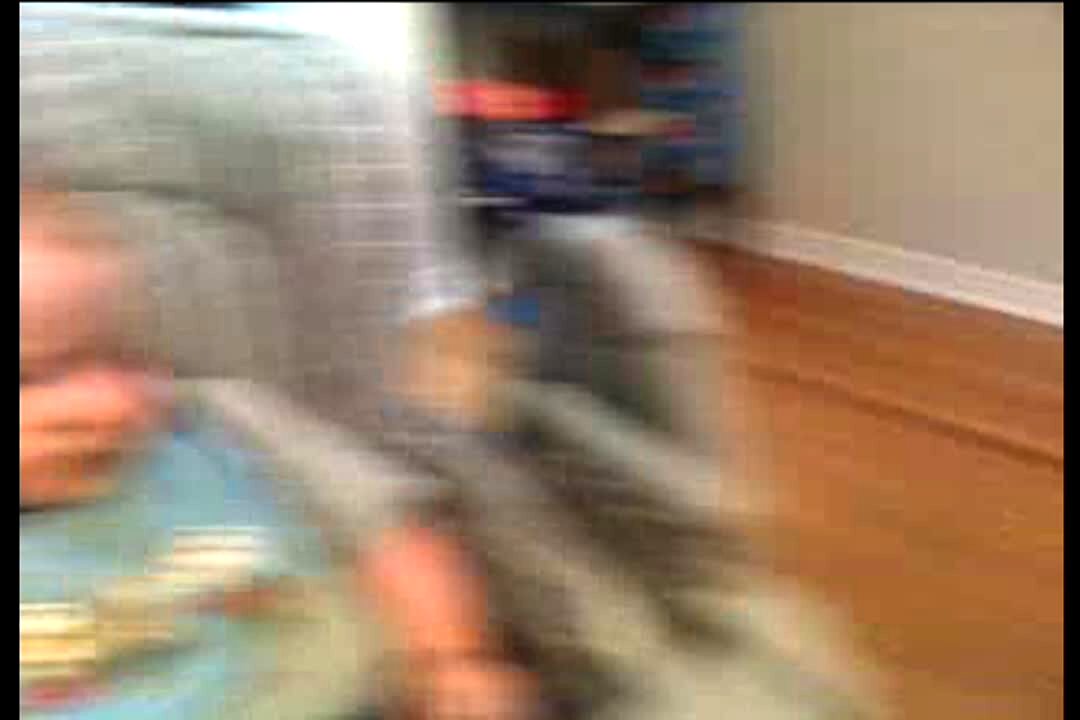 Baby girl in high chair dances and shakes her head back and forth to the music. Camera cuts to twin brother who's scowling at his sister, then cuts back to girl who's smiling and dancing. Sibling rivalry.