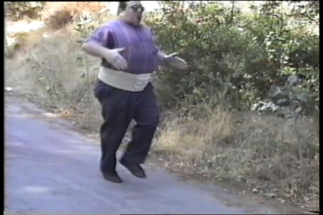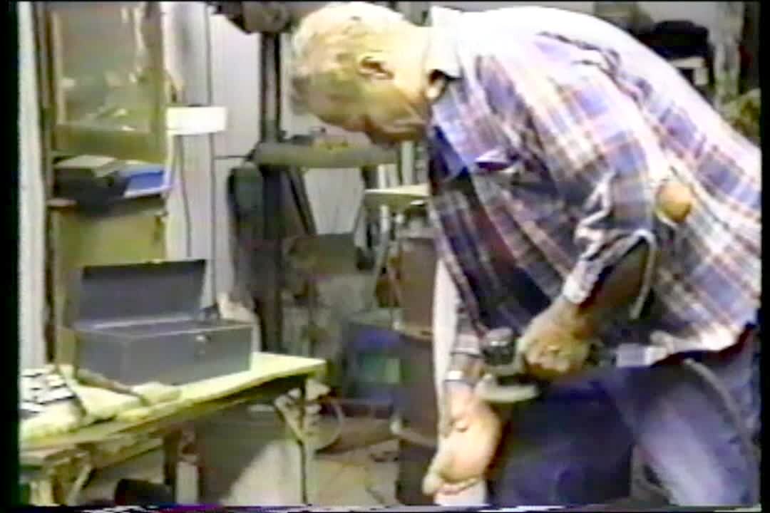 Warehouse worker rides forklift fast up ramp & crashes, falls. Man hits into another hand truck hard. Stunt, trick, bonehead, labor. (X-mas 99)