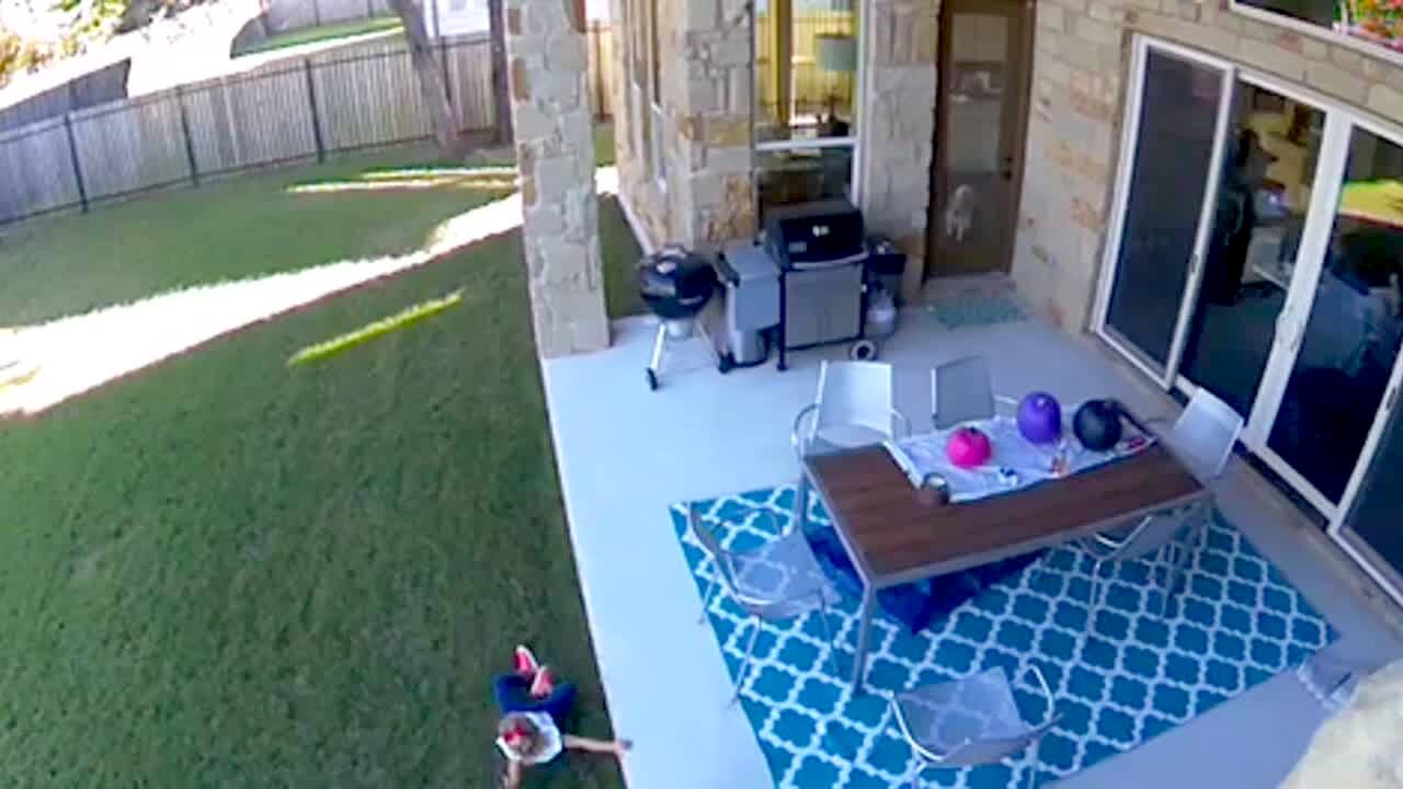 A young girl falls off a porch. A woman gets up to help her and also falls off the porch. Security camera footage.