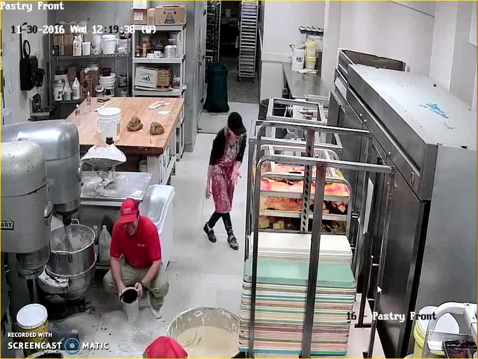 A man operates an industrial sized mixer in a bakery kitchen. When he turns it on, flour shoots out and goes all over this woman coworker. Security Camera Footage. Work