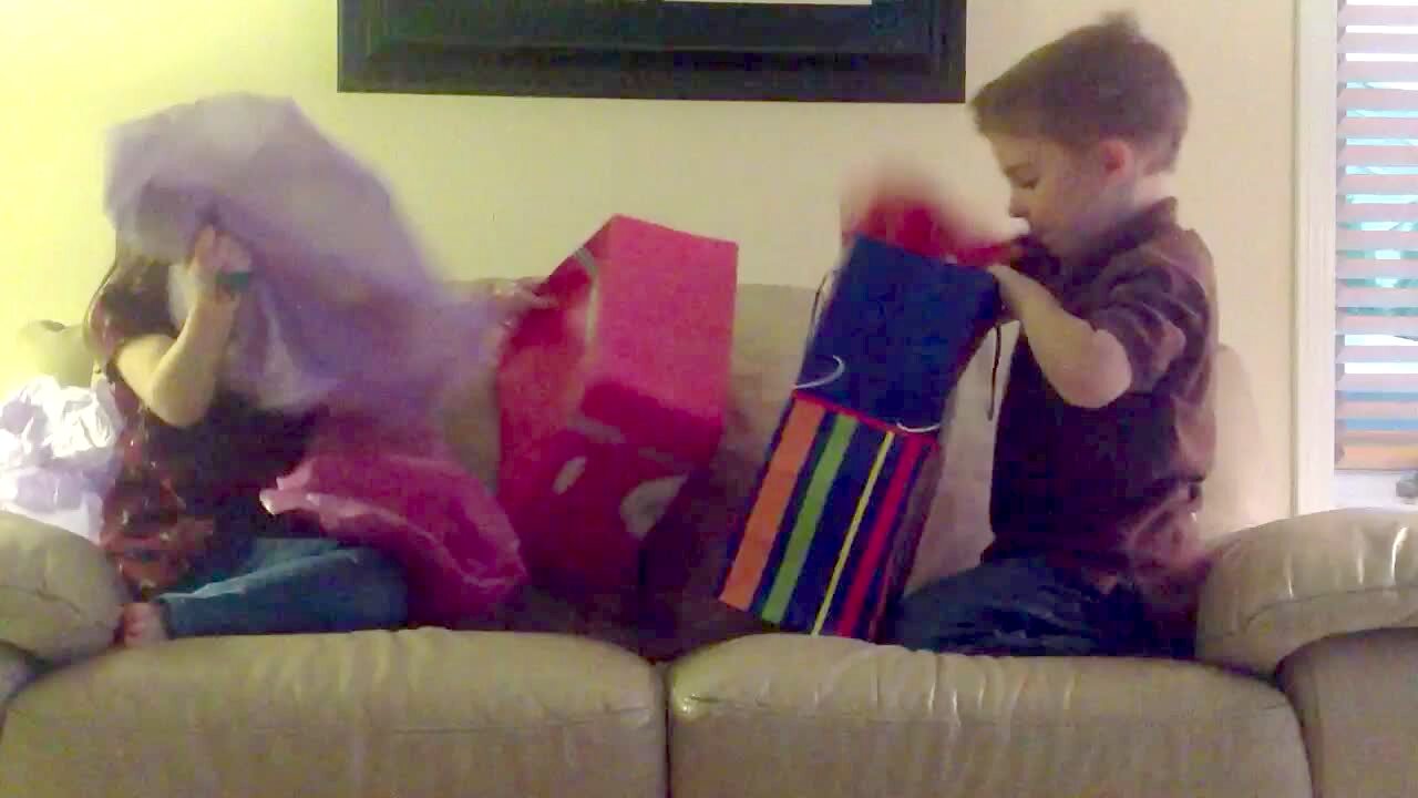 A twin young boy and girl excitedly open birthday gifts in unison on a couch indoors. They see that they both got shirts then cry at the same time.
