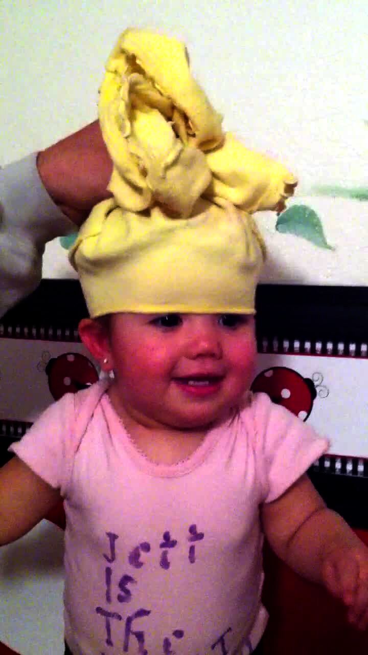 A man tries to take a shirt that's too small off of a girl tot indoors. He pulls it over her head and she makes funny faces to the camera.