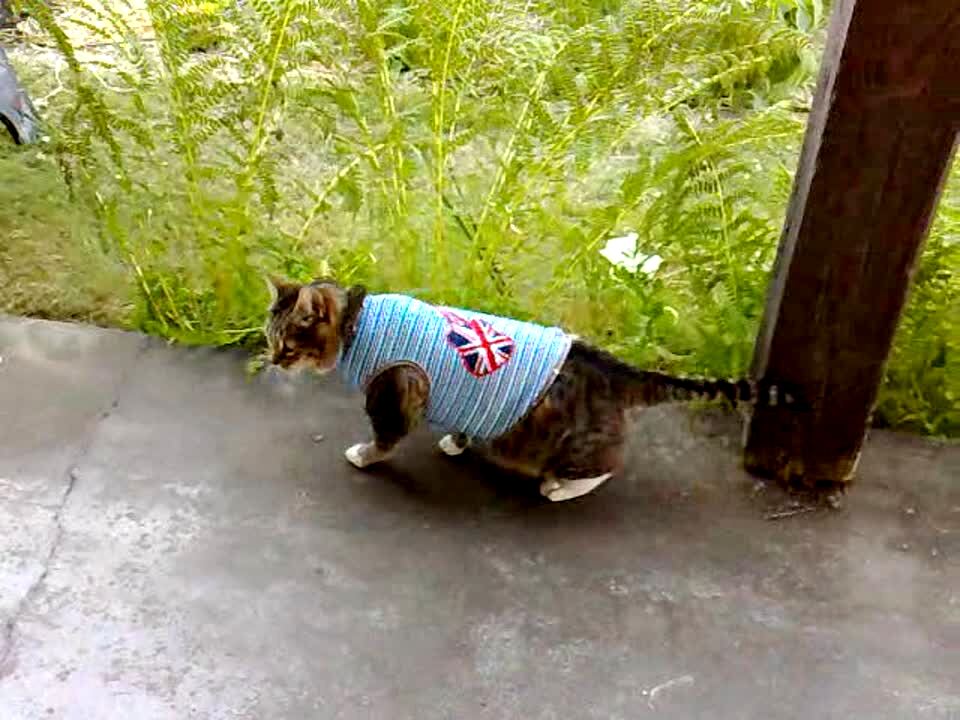 Gray white cat wearing a blue shirt sweater walks up to a can of paint and smells it, it falls off the porch.