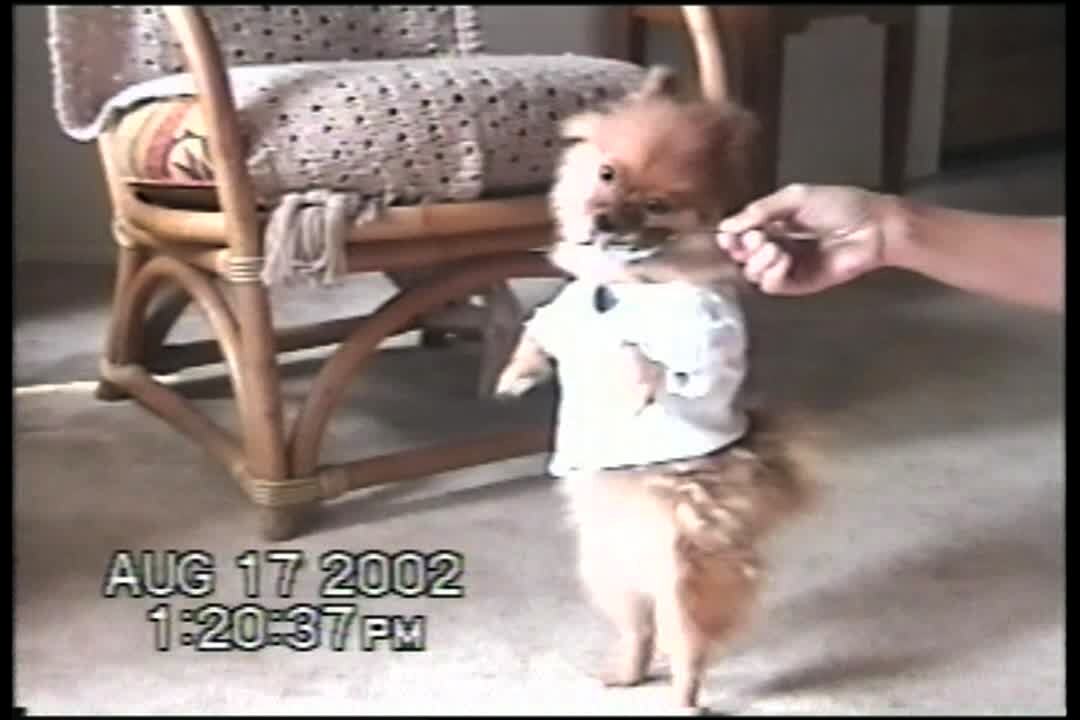 Puppy dog with a T-shirt on stands on hind legs and eats off a spoon.
