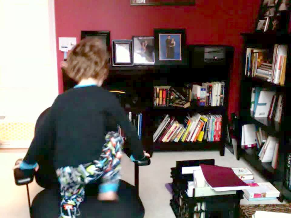 A young boy dances on a desk chair like a monkey. A man roars at the boy in the background. The boy screams and jumps off the chair. Pranks.