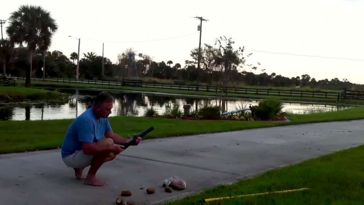 A man tries to shoot a potato out of a new potato cannon while his family watches outdoors. The potato hardly shoots into the air and the family laughs.