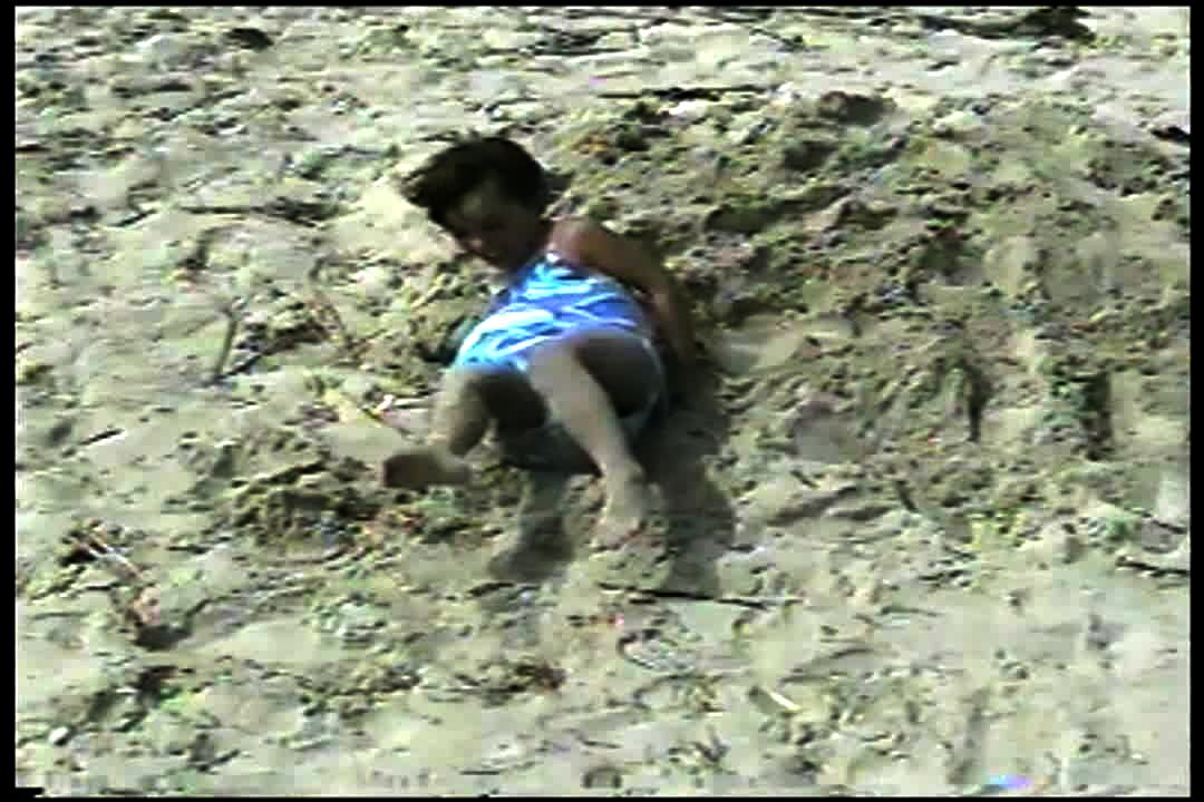 A young girl and two young boys all fall when they run out of the ocean. Featured talent cleared only (the three children who fall in the water)