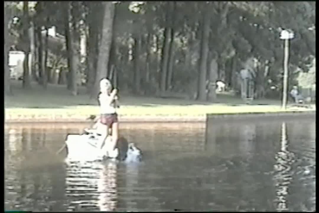 Boy & girl fish. Girl thinks she caught a big fish & says "Get Dad." Dad pops out of the water with her line in his hand. Practical joke.