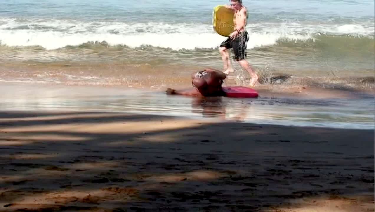 Bald man tries run and jump and boogie board on stomach on beach, face plants into the sand. Fall downs.