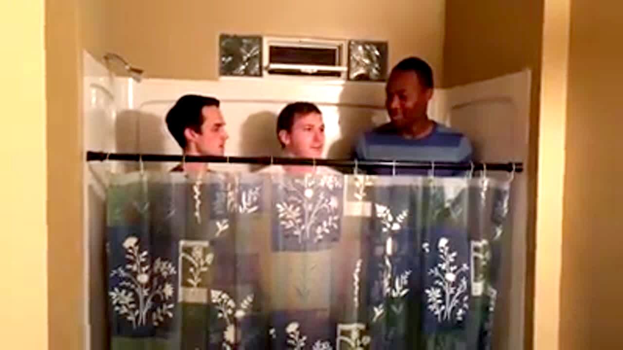 Three men all stand in a shower together at home for the Cold Water Challenge. When they turn the water on, they scream and whimper and one of the men falls out of the shower, tearing down the curtain.
