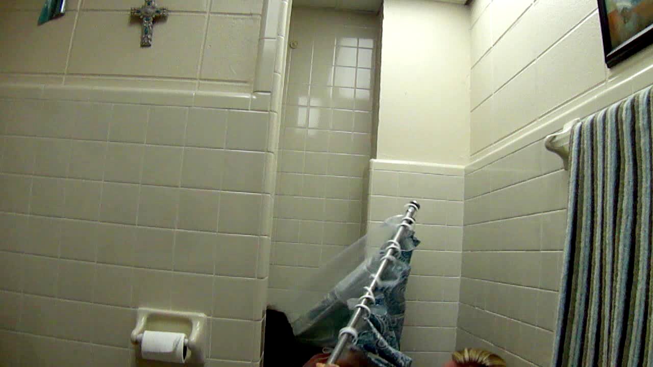 Teen girl standing on the side of the bathtub with toys slips & falls backwards, bringing the shower curtain down with her.