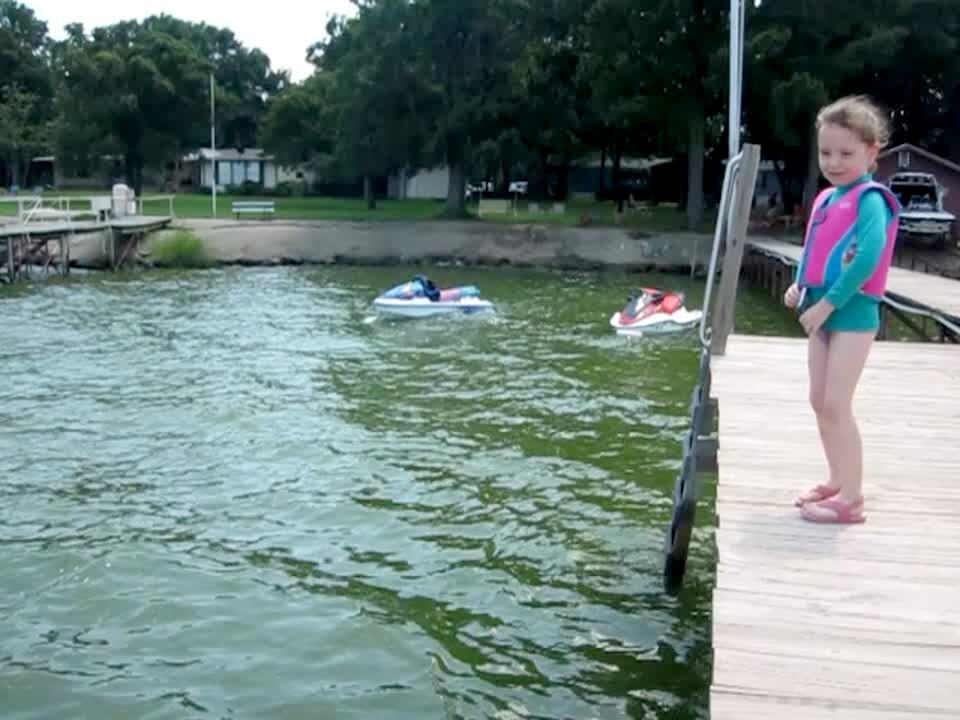 A little boy pushes his twin sister into a lake.