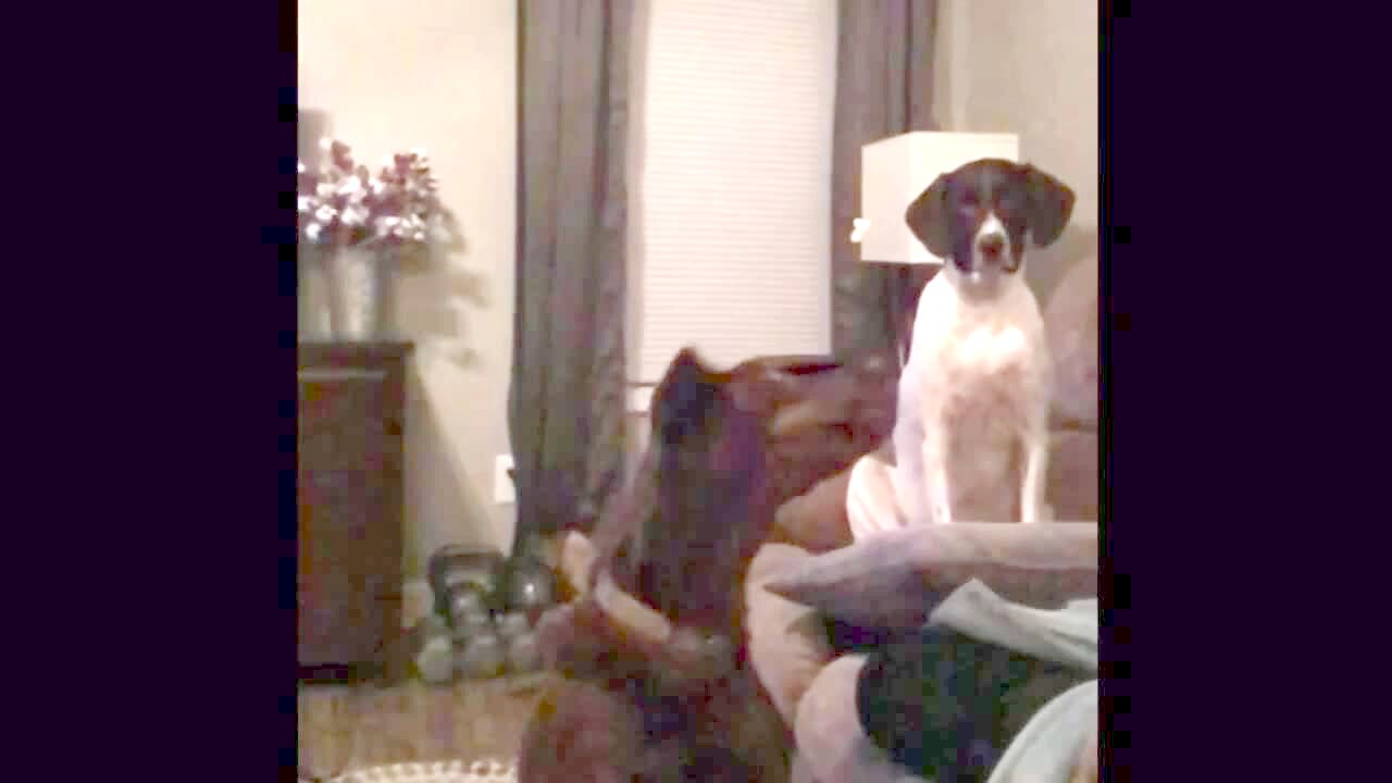 A sleeping dog wakes up when the AFV theme music starts. She walks over and lays on the couch and watches the TV.