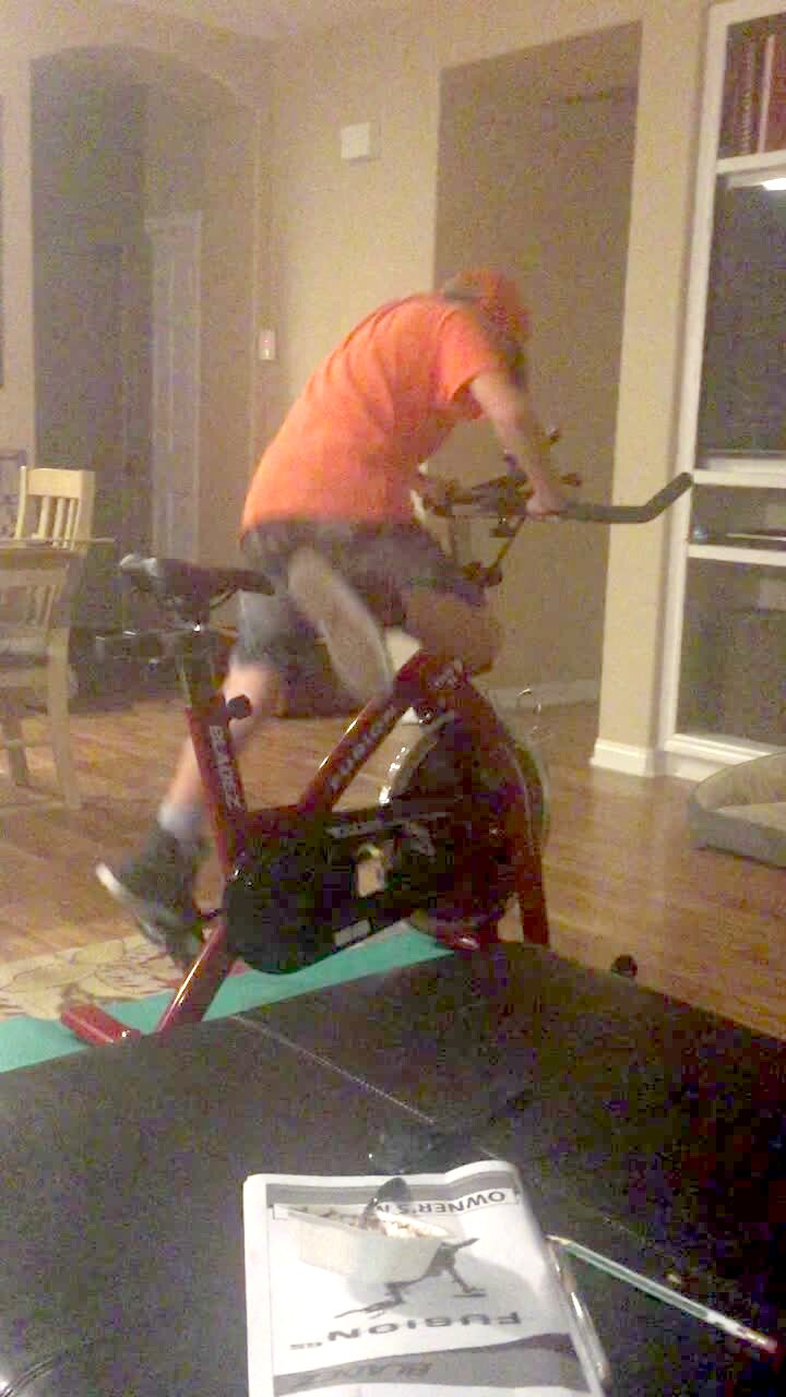 A young boy rides a spin stationary bike then he stands off the seat and balances on one foot and and screams "how do I make it stop!?" over and over again as it continues to spin.