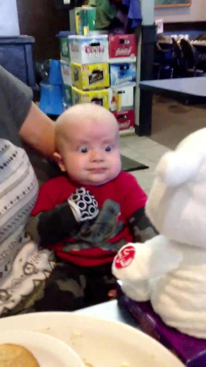 A woman tickles a baby boy indoors and he laughs. Toys For Tots Tickle Challenge.