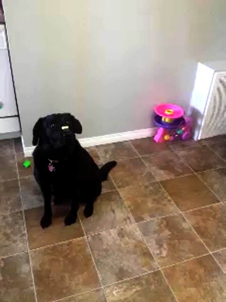 A black lab dog balances a treat on her nose as a tot boy walks up to her, grabs the treat, and eats it.