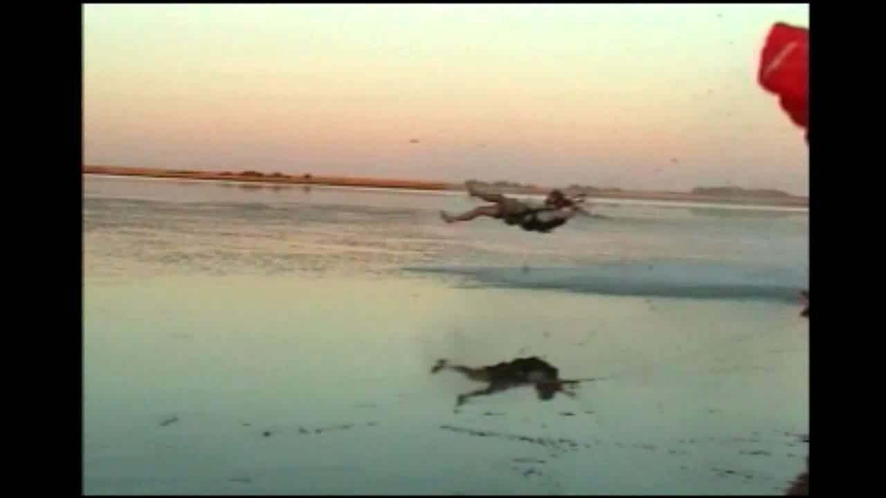 Man tries to land in a lake after skydiving. Man crashes hard into the water, then gets up & yells "yeah!" Good recovery. Parasail, parachute.
