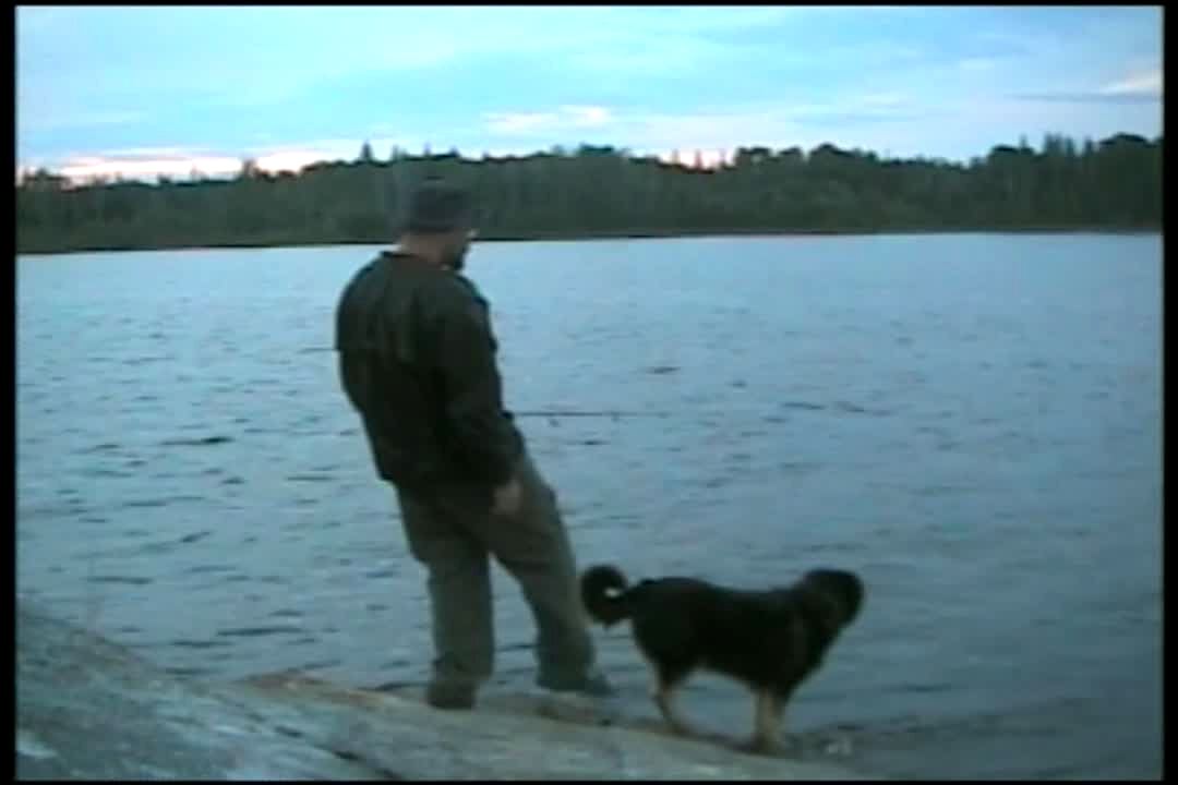 Man fishing on the edge of lake. He tries to push dog into lake but ends up falling in himself.