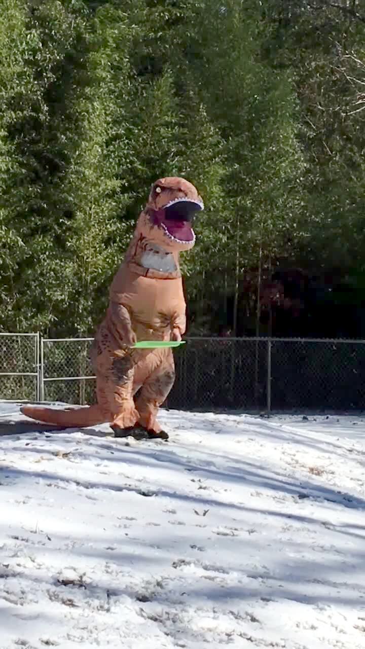A man in a T-Rex Costume sleds down a hill in the snow. He then falls down and rolls further down the incline.