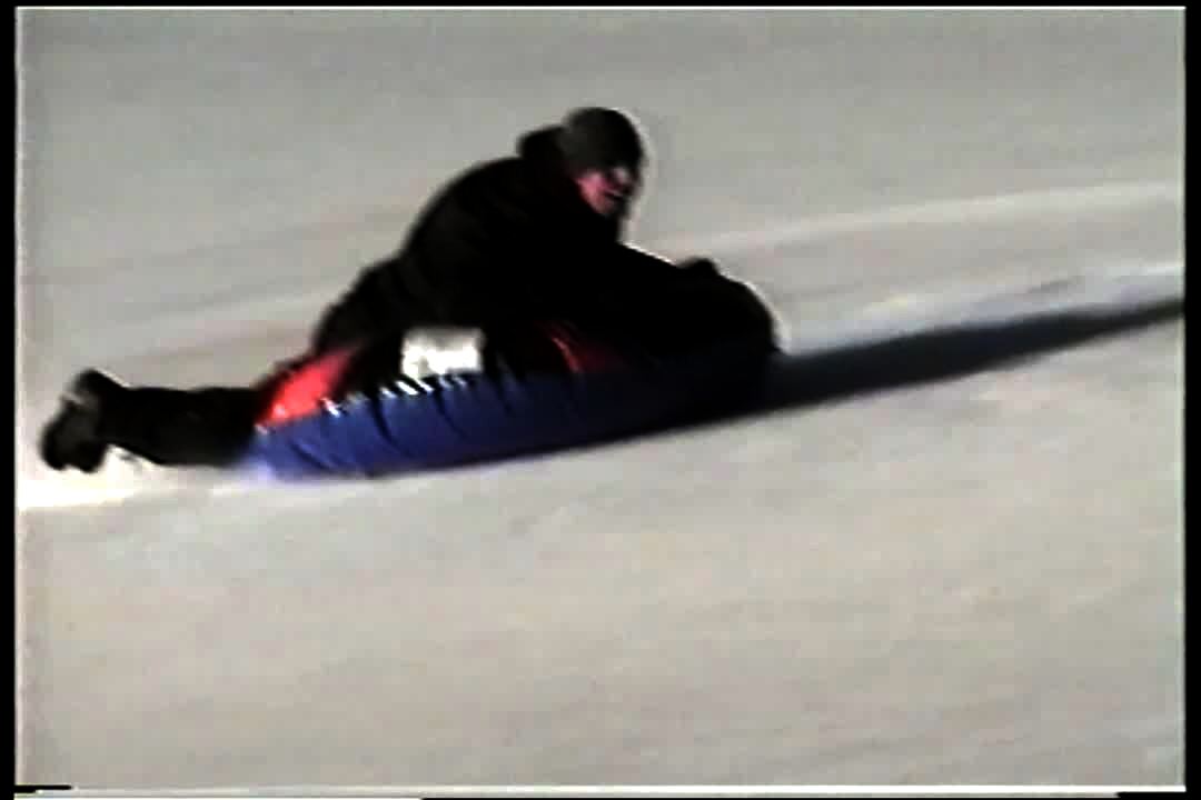 Man on snow sled/ tube goes fast down hill and crashes hard. He lands on his face.