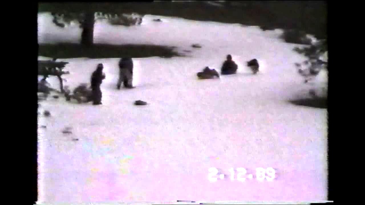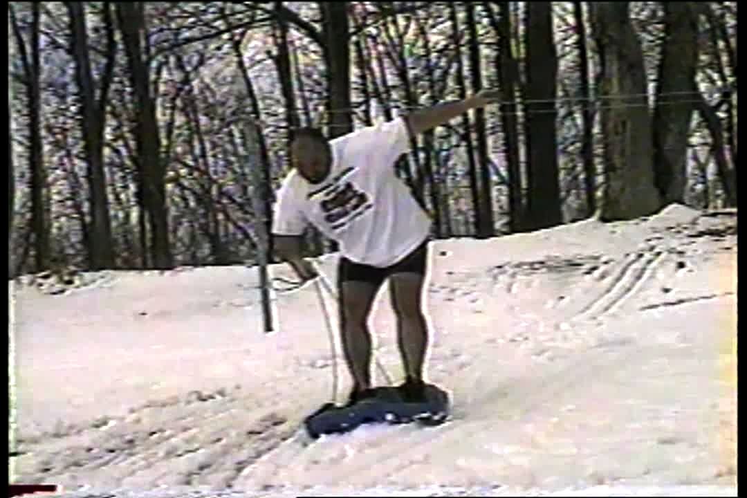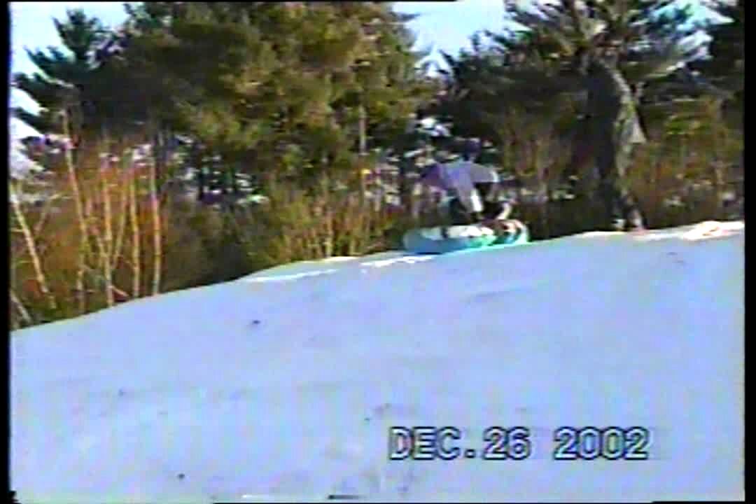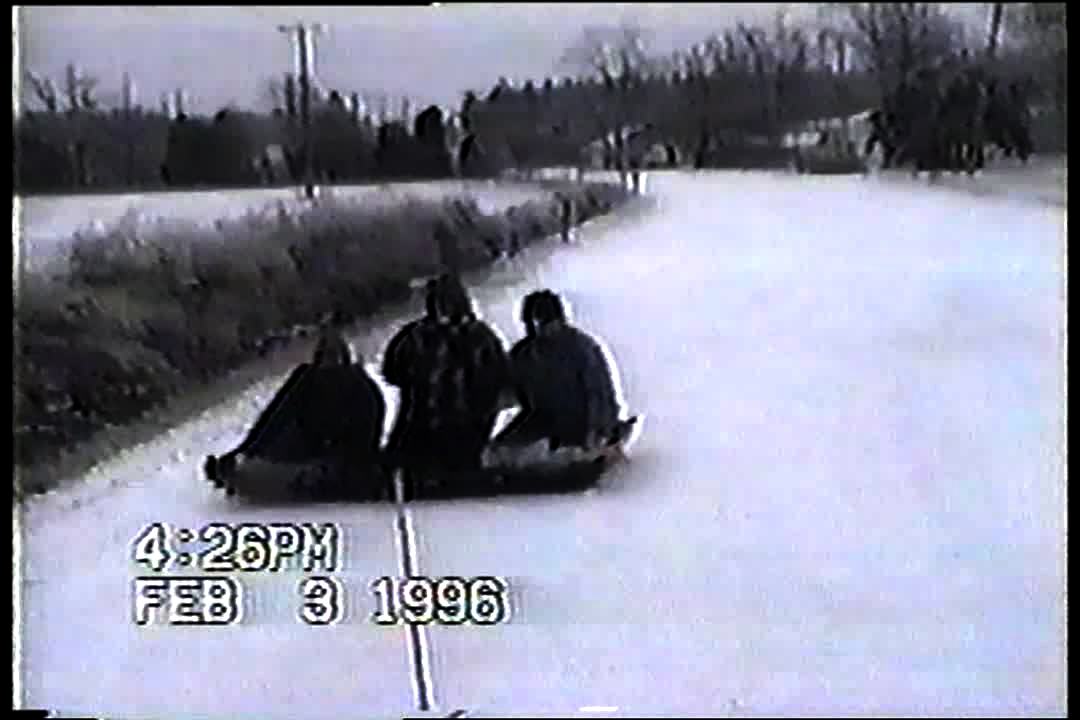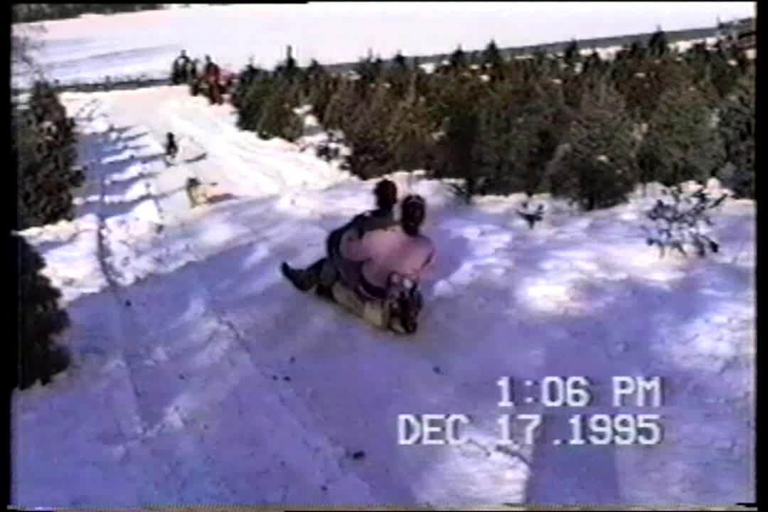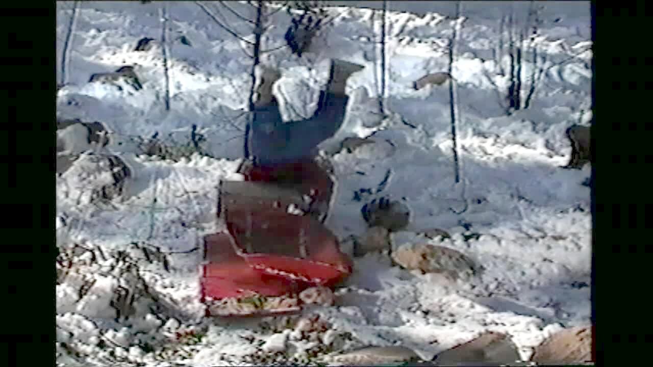 Boy snow sledding, wipes out. Looks up, and another sledder runs over his head. Looks like decapitation.