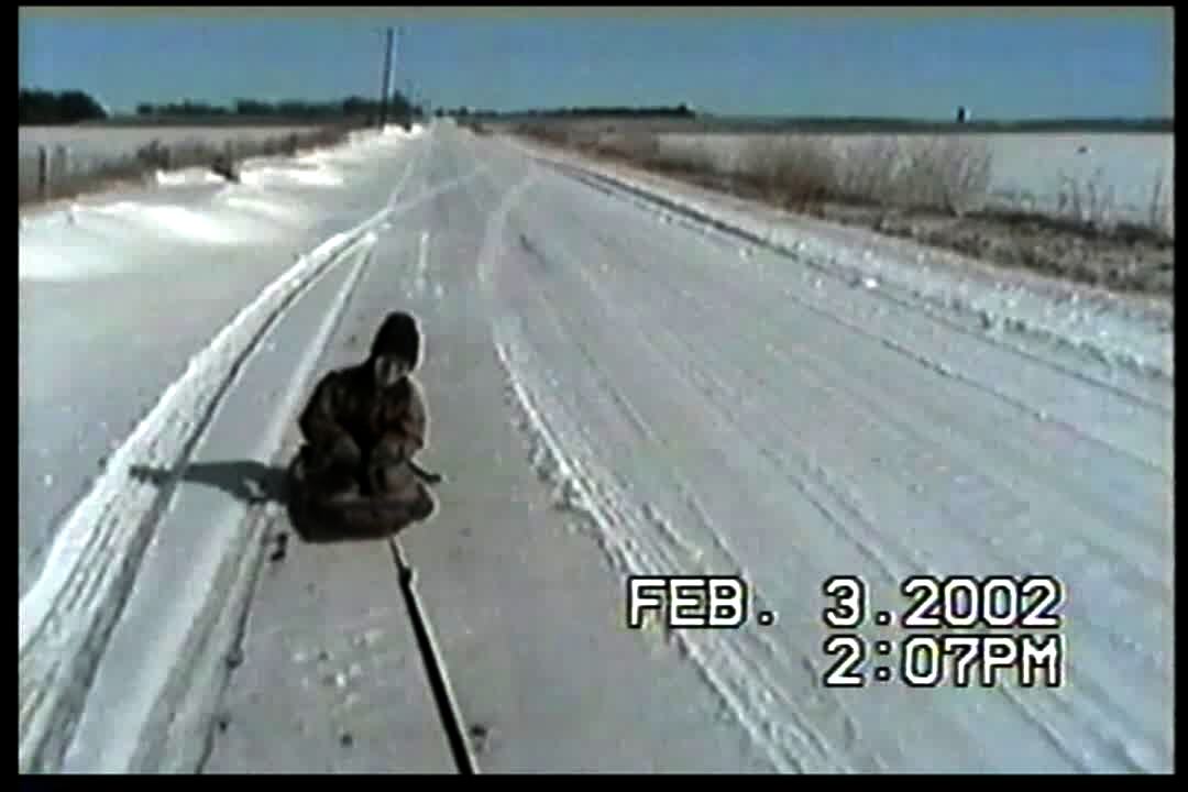 SLEDDING. Boy on sled, sled stops, he somersaults off.