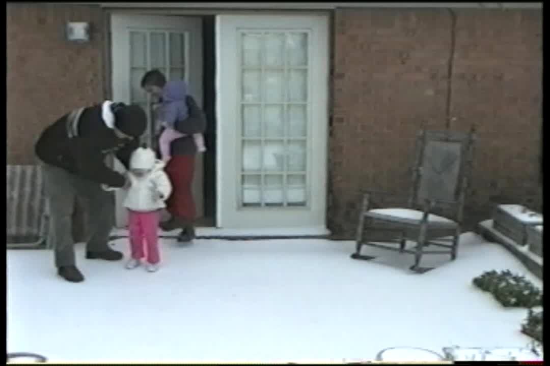 Man walking with his daughter in his arms, slips on the ice and falls. Tries to grab camera. funny fall.