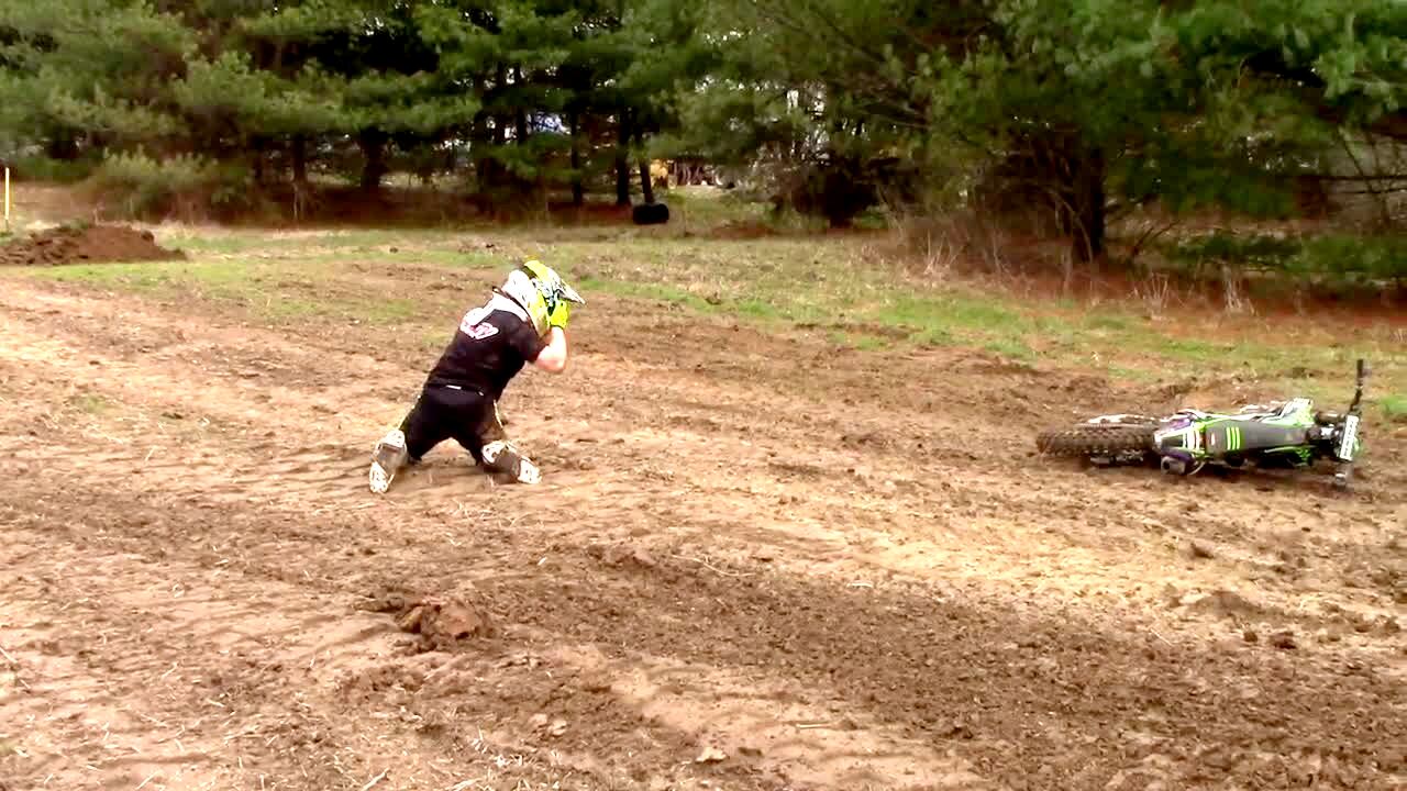 A young boy drives a power wheels ATV four wheeler in the yard, then crashes it off screen behind a car in the driveway. His mother walks around the car with the camera to find him on the ground as he says he's okay.