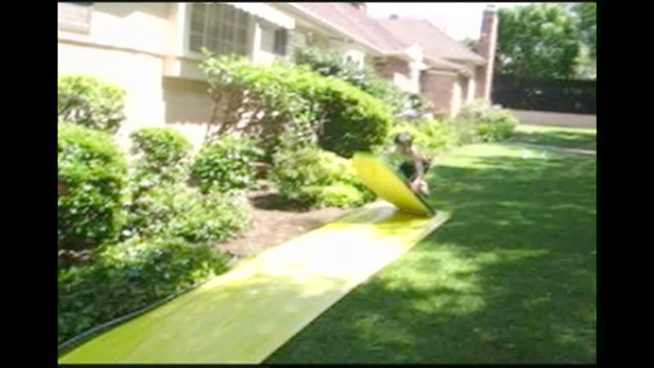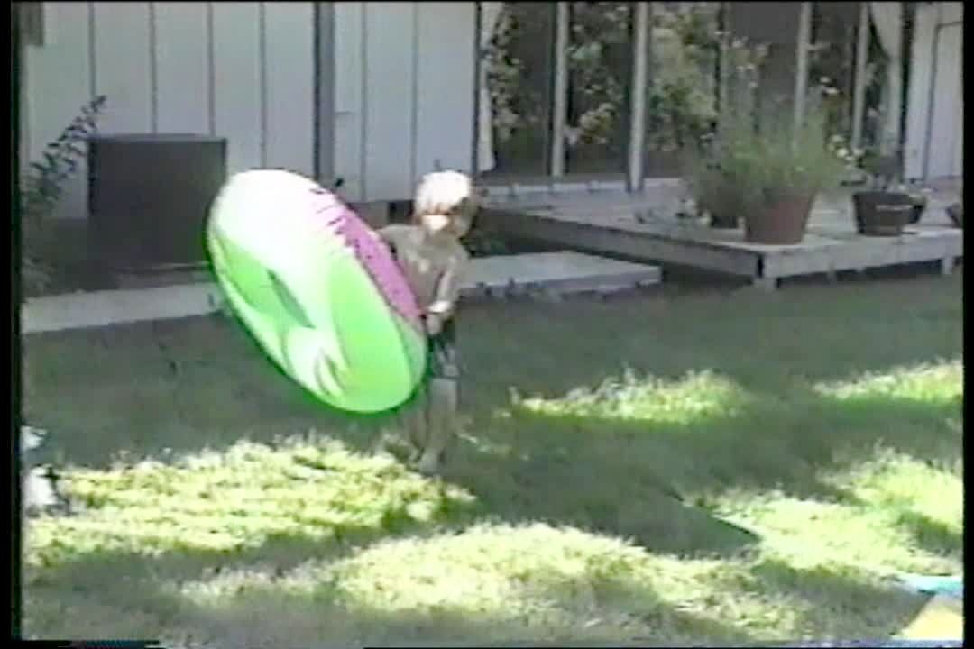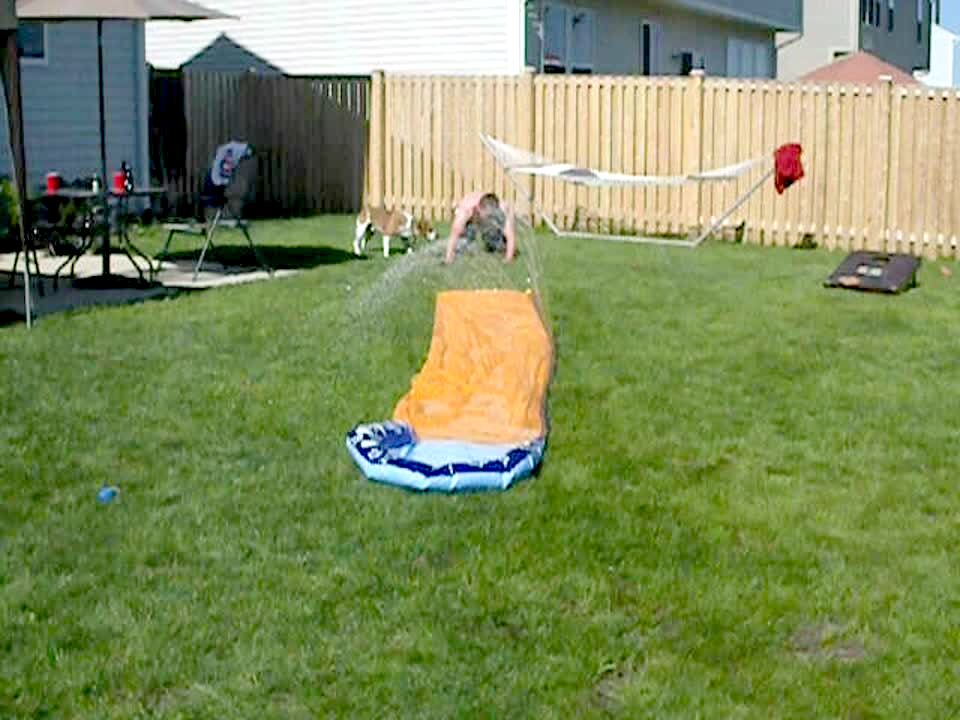 Big man tries to stand up and slide down slip and slide. He falls and hits his head on the ground. No tail.