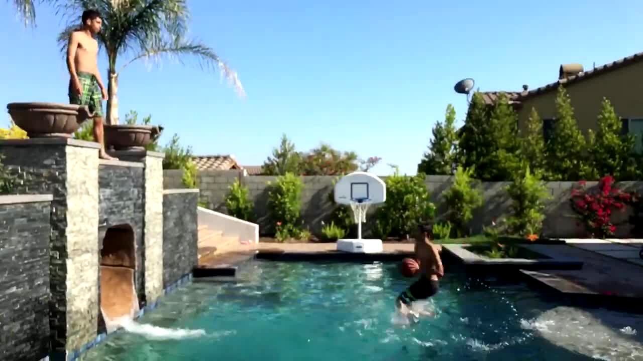 A group of teen boys do a basketball trick shot where one boy throws it across the yard to other boys at a pool who catch it and pass it to each other and the last boy shoots it into the hoop in slow motion.