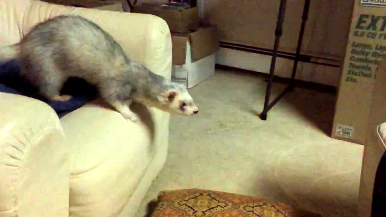 A ferret jumps off a couch in slow motion indoors and aims to land on another couch but misses and falls down.