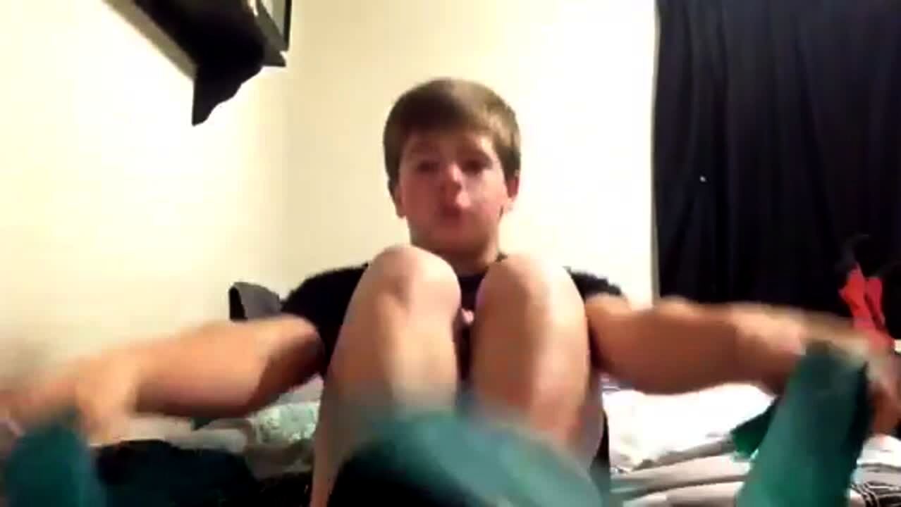 A teen boy plays with an exercise rubber band indoors and stretches it over his feet before it slips off and hits him in the face.
