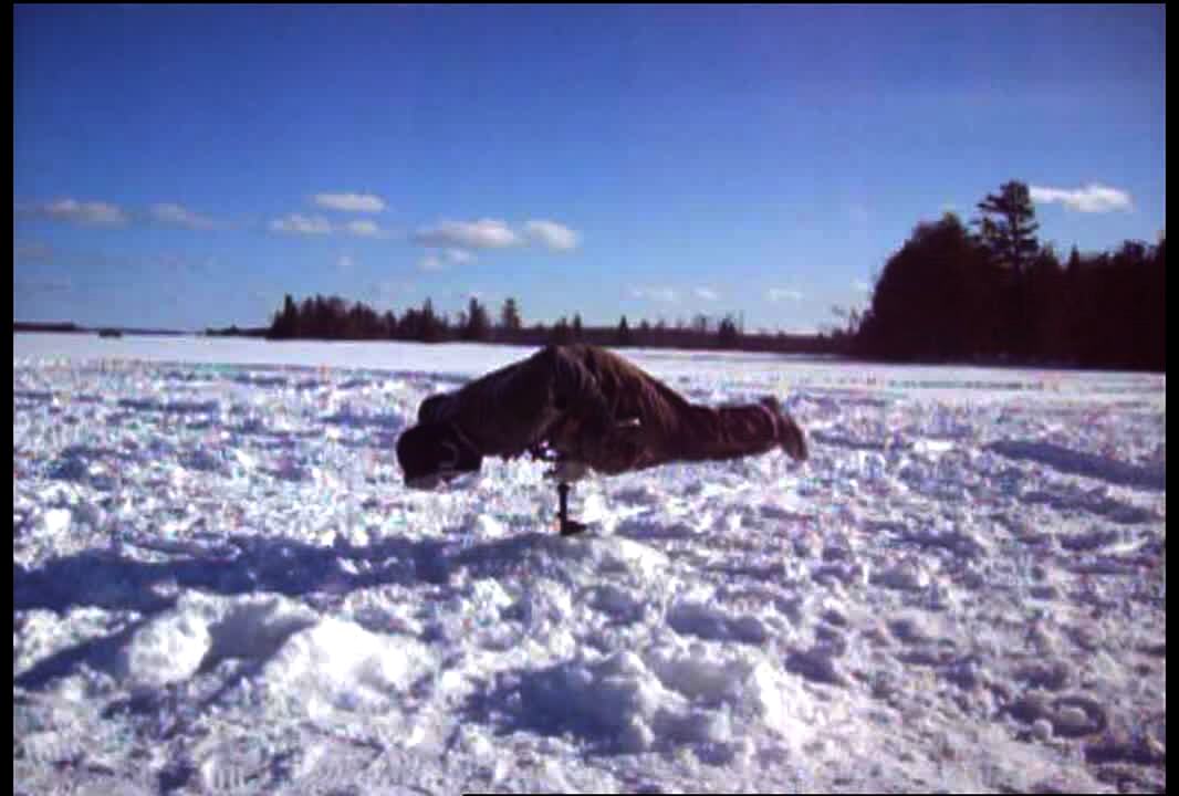 Young man tries to run across frozen creek, the ice breaks and he falls in. Bonehead. Winter, snow, slippery, icy.