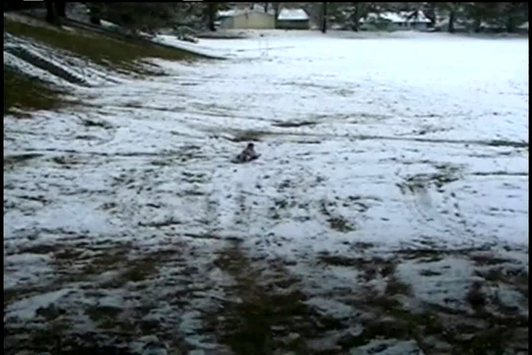 A boy sleds down a hill outdoors. A man gets humped by a dog in the background.