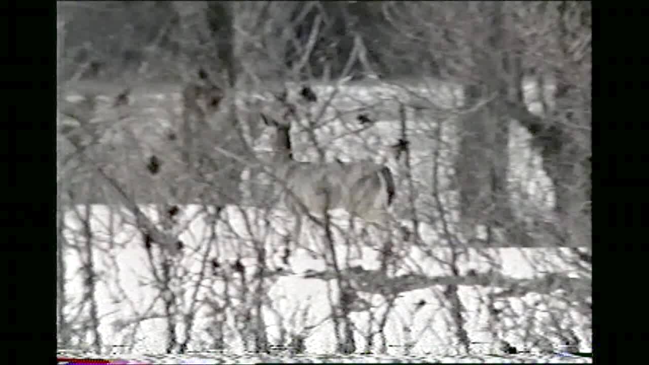 Security camera footage of a deer that runs in to a glass door. Shortly after the deer hits the door, a dog walks up to the door to look around.