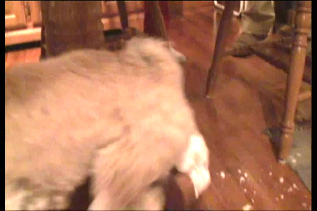 2 fluffy white dogs have large balls of snow stuck to their feet & have trouble walking when they are let back in the house from being outside. Winter. Dogs put their feet up like they have booties. Funny visual.