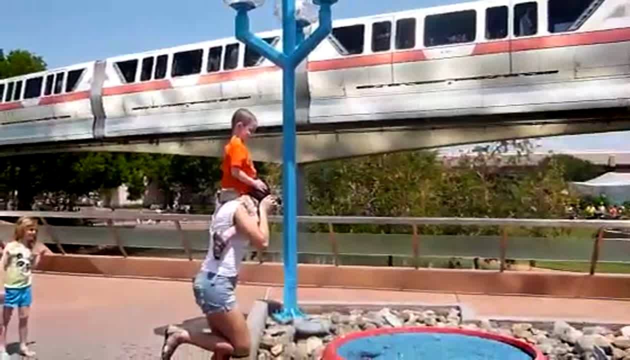 Tot boy on mom's shoulders is sprayed in the face by a fountain at Disneyworld.