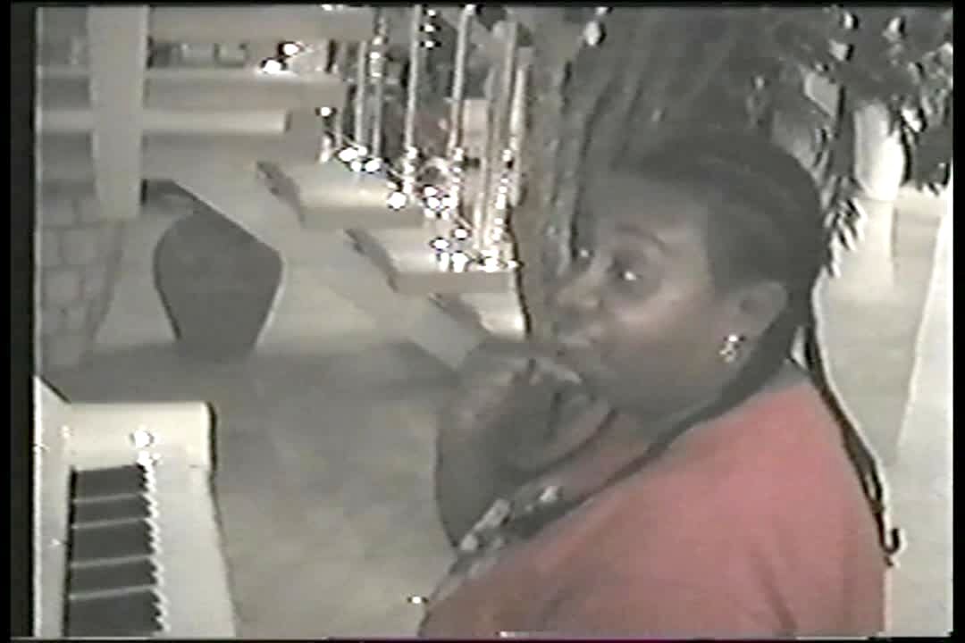 Woman sings "Silent Night" very badly. Woman playing piano makes a funny face & does throat slitting movement to suggest woman should stop. Christmas songs.