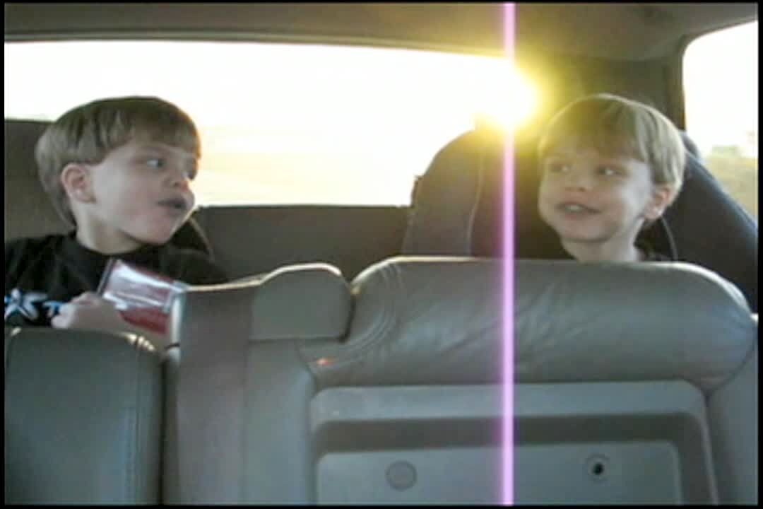 "The Tart Twins" Twin boys eat sour candy at the same time. Boys like it at first & then they both start crying when it gets too sour. In the back seat of car on road trip.
