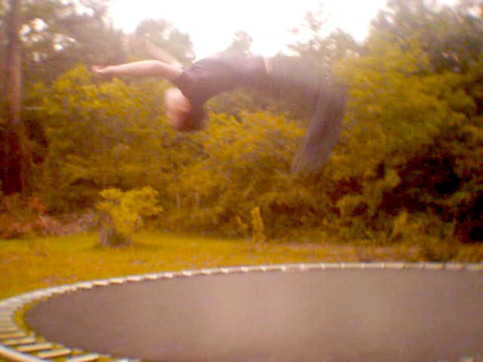 A boy bounces on a trampoline. and does several back flips over and over. He jumps right down with his feet in between the springs of the trampoline and falls down hard to the ground.