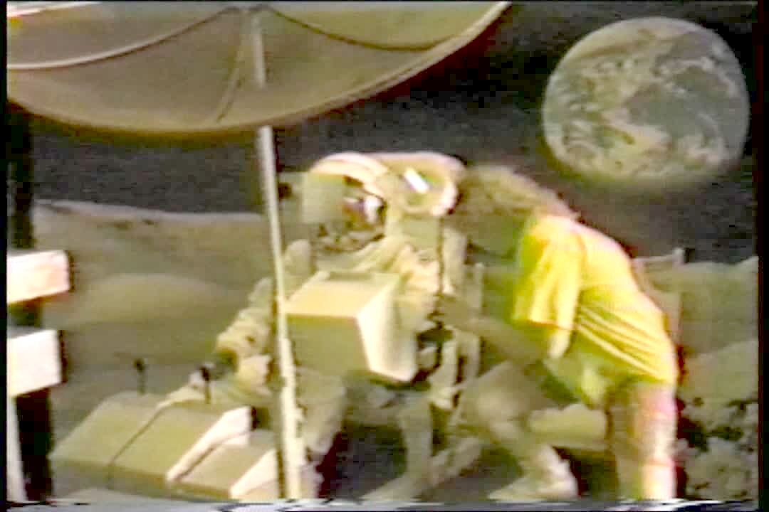 SPACE. Woman sits next to astronaut during exhibit, he moves, she's scared.