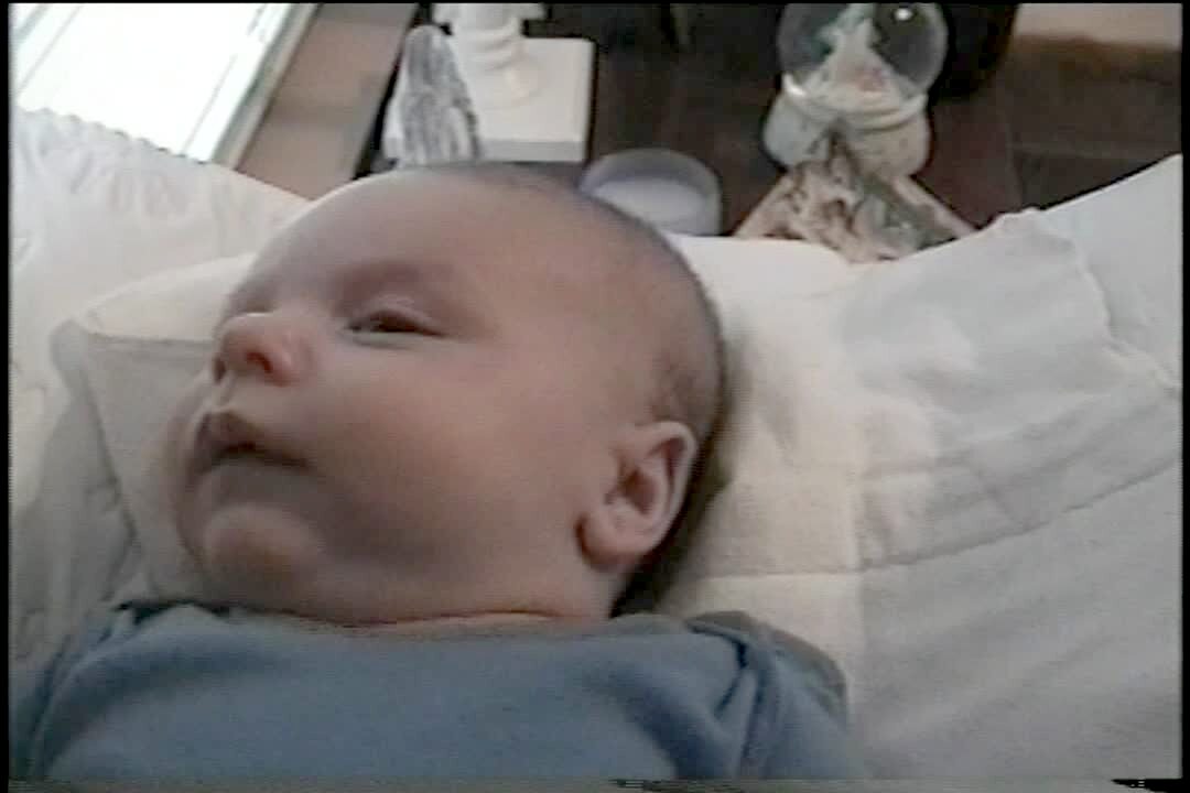 Baby boy stares at the camera as he lays on his back and smiles a bit, then it sounds like he says "I love you." Baby talk.