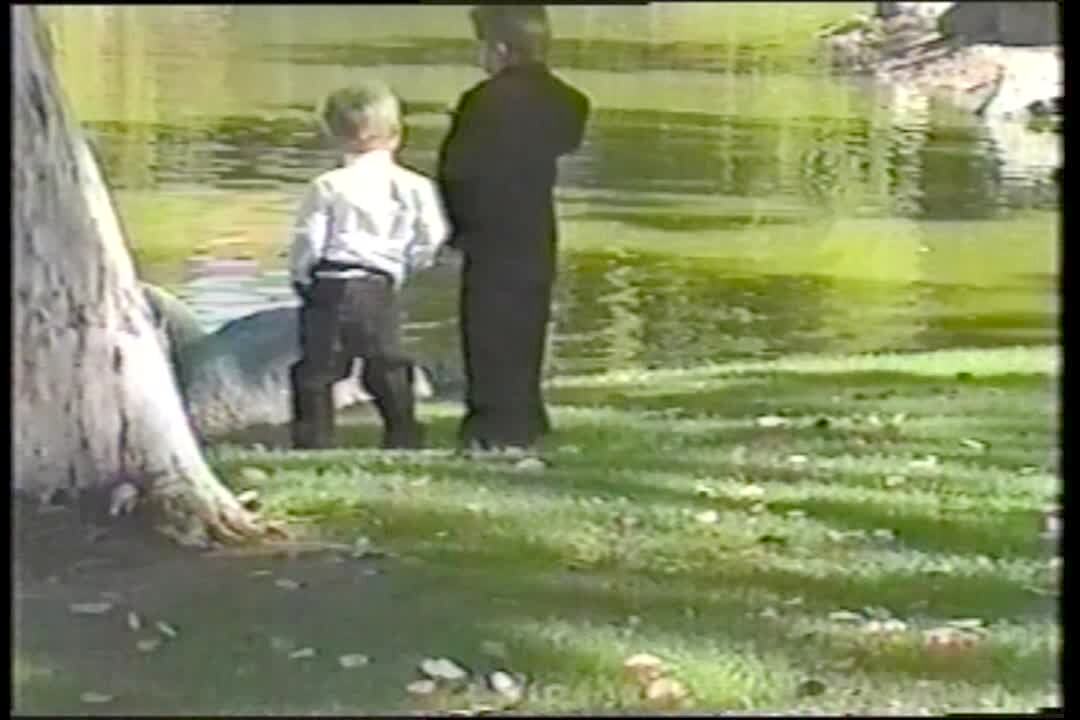 2 little boys fight near pond during wedding ceremony