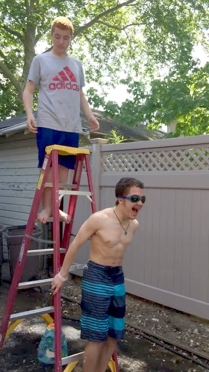 A teen girl stands outdoors while her friend stands on a chair behind her with a large bucket of water. The girl on the chair tries to lift up the bucket but loses her balance and falls down with the chair and bucket. ALS Ice Bucket Challenge.