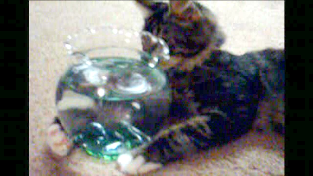 A man gets hit in the face with water when he falls for the coin in the water bottle trick. He then chases his son around the table and slips in the water on the floor.